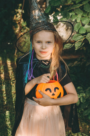 Happy Halloween day. A little cute girl in a witch costume is holding her pumpkin with candy in her hand. Halloween party, kids trick or treat, close-up.