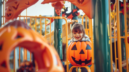 Young girl enjoying Halloween at a playground with a pumpkin. Concept of Halloween fun, childs play, festive decorations, autumn celebrations.