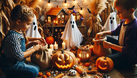 Children joyfully celebrating Halloween with vibrant pumpkins and colorful costumes galore
