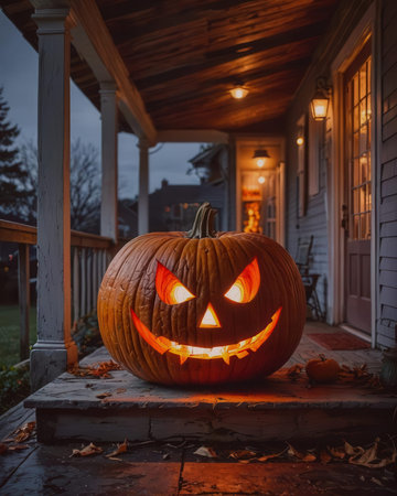 Glittering spooky Halloween pumpkin on home porch. Seasonal House decoration