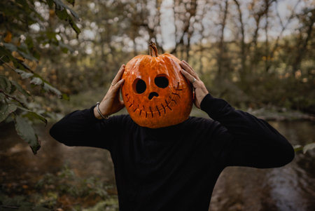 Scary man with pumpkin head for Halloween. Jack-o-lantern costume.Trick or treat