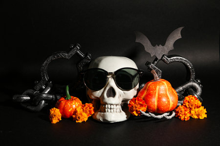 Halloween skull with sunglasses, pumpkins and shackles on black background