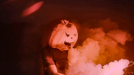 Halloween human pumpkin or Jack o lantern costume on a dark night with lots of smoke, a chainsaw, and reddish fireworks