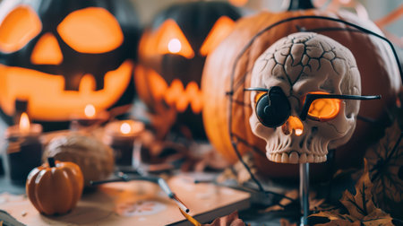 Carved pumpkins glow with candlelight alongside a skull and autumn leaves, setting a festive Halloween atmosphere.