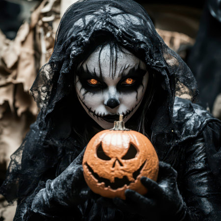A character dressed in dark, tattered clothing holds a carved pumpkin. The eerie setting adds to the Halloween atmosphere with glowing eyes and a haunting expression.