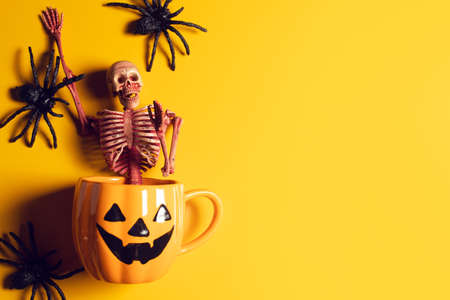Orange background with skeleton, feathers and mini pumpkins. Halloween