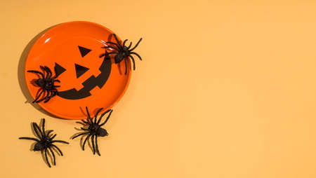Halloween background, decorations and scary concept. Skeleton and spiders, black bats fly over bright orange background