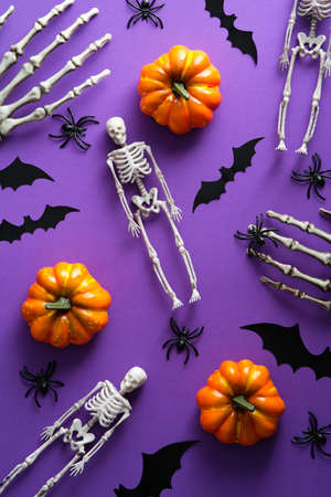 Happy Halloween holiday concept. Flat lay, top view pumpkins, skeletons, bats, spiders on purple background.
