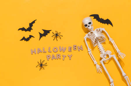 Skeleton and bats, spiders on bright orange background with the word Halloween party. Halloween theme. top view
