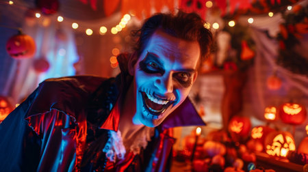 Man Dressed as Vampire Smiling at a Halloween Party. Concept of Costume, Festivity, Celebration, Holiday Spirit.