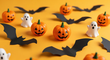 Halloween decorations with smiling pumpkins, flying black bats, and cute white ghosts on bright yellow background for festive atmosphere.