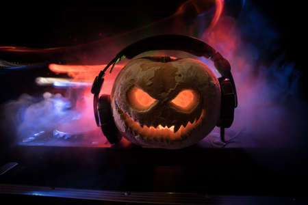 Halloween pumpkin on a dj table with headphones on dark background with copy space. Happy Halloween festival decorations and music concept