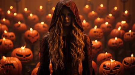 The evil witch casts a spell on pumpkins. Portrait of a woman in a carnival halloween costume in the dark