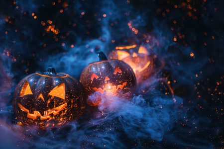 Three carved pumpkins with eerie faces emit a warm glow as smoke swirls around them, creating a mysterious Halloween atmosphere.