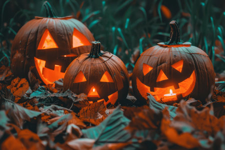Three carved pumpkins emit a warm glow, resting among fallen leaves in a darkened setting, capturing the essence of Halloween.
