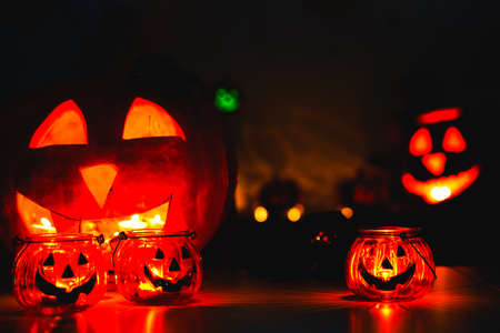 Pumpkins with carved grimaces and candles inside in the dark for halloween. Jack o latern in smoke.