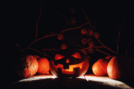 Halloween holiday concept with jack o lantern in dark shadow background