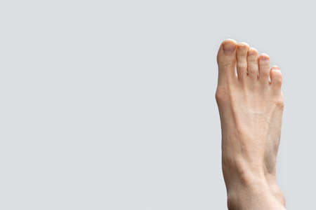 Hallux valgus, bursitis of the foot on a gray background. Fungus of the nails on the disease of the feet.