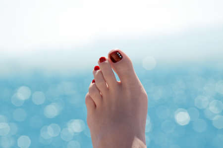 Female feet with red pedicure on grass with water background. Summer and holiday concept