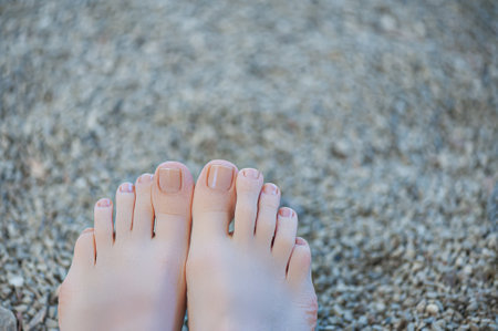 Female feet with clear pedicure. Woman legs with clear nail design on small rocks background