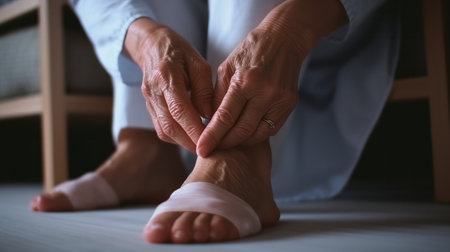 A healthcare provider in gloves inspects a patient's foot, focusing on the toes. The examination takes place in a clinical setting, highlighting attentive care and professionalism.