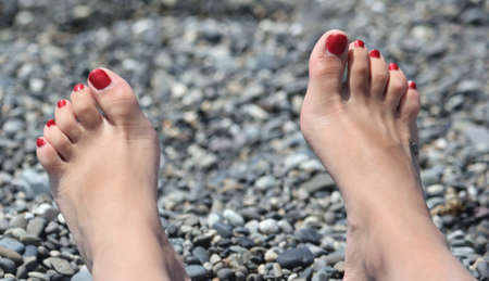 Girl's leg with a red pedicure on a pebble beach by the sea.