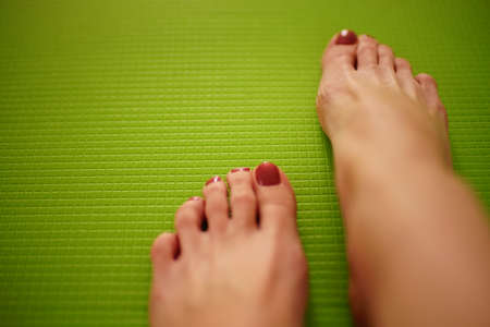 Close-up of female feet painted grey nail polish, self made pedicure at home. High-quality photo