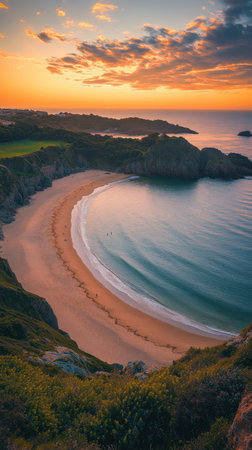 Generative AI : Aerial view of Porthcurno beach along the coastline with cliffs and The Minack Theatre at sunset Cornwall United Kingdom