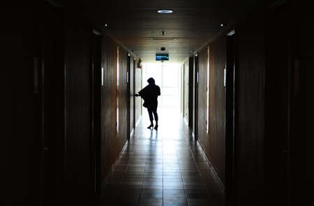 A dimly lit corridor stretches ahead, lined with wooden doors and inviting an air of suspense and curiosity during night time.