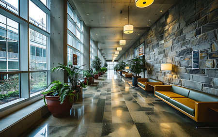 The great long hallway that stay inside the architecture that similar to the hospital with a green tree that stay on the shiny cleaned floor that reflect a light in the brightest morning day. AIGX03.
