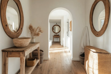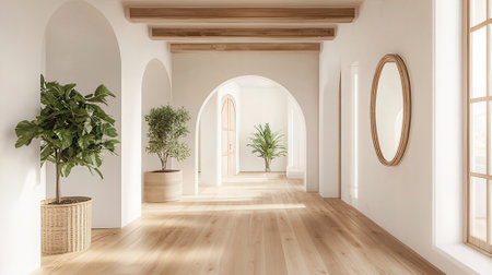 Interior of modern empty room with white walls, wooden floor and round mirror. 3d rendering