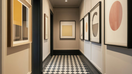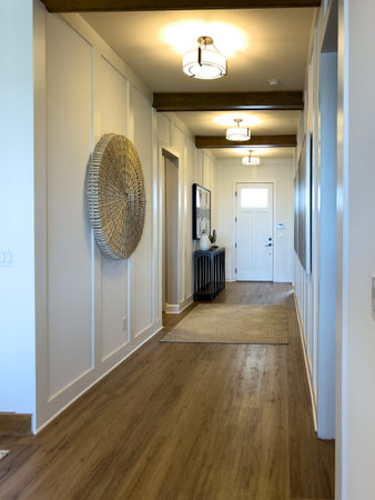 Parker, Colorado, USA-June 19, 2025 - A bright hallway with warm wood flooring and modern decor in a luxury model home. Round wall art and recessed lighting add a touch of elegance to this transitional space.
