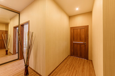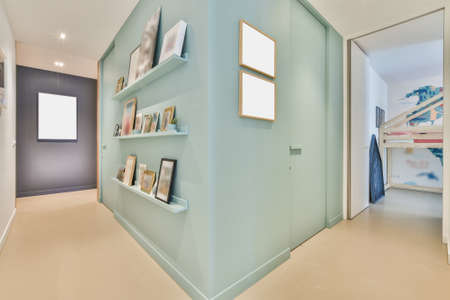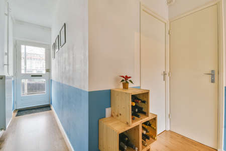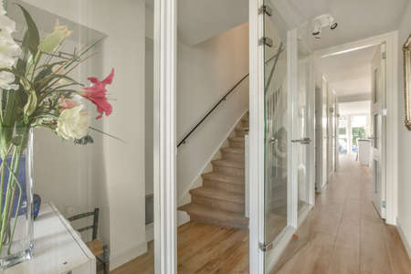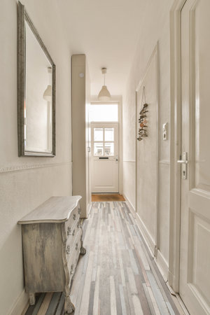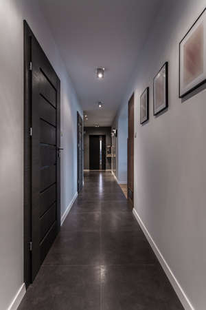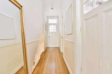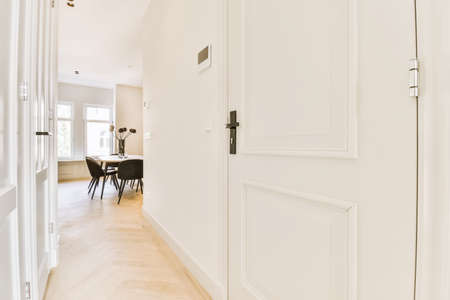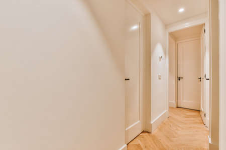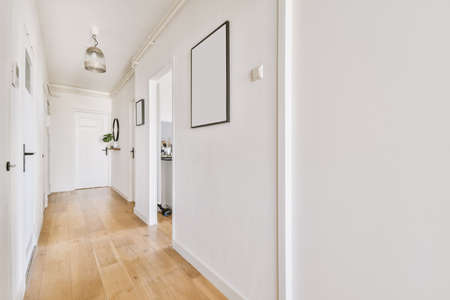 Interior of contemporary flat in minimal style with spacious hallway with white walls