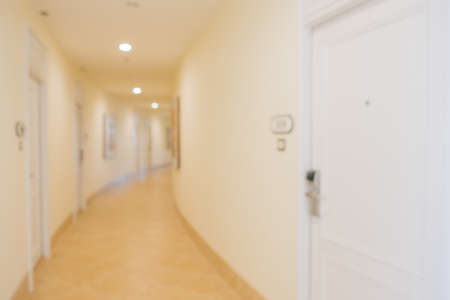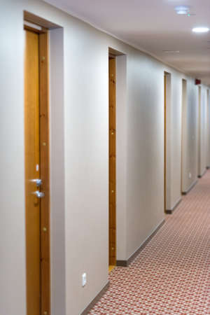 Narrow light corridor with doors of rooms illuminated with lamps inside modern hotel