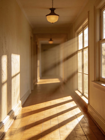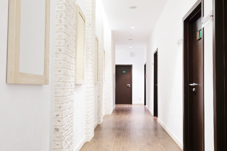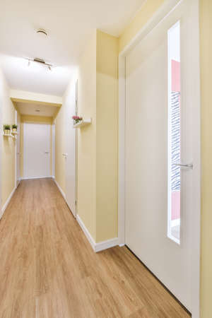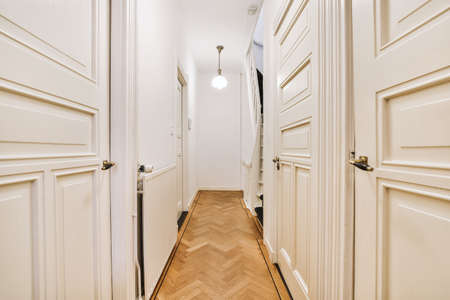 Light narrow hallway with many doors in white walls and glowing lamp over lumber floor