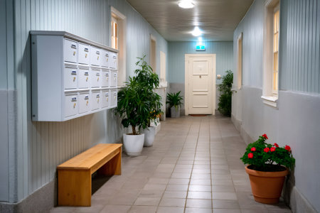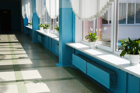 Bright school interior features live plants on windowsills, with sunlight illuminating the space, enhancing the learning environment and promoting a sense of well-being