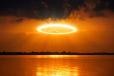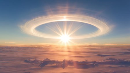 Experience a stunning sunrise featuring a unique ring formation in the sky. This captivating natural landscape captures the beauty and serenity of a new day.