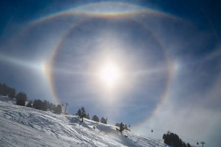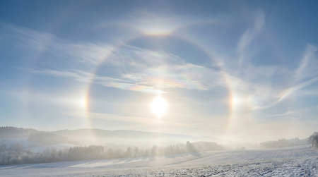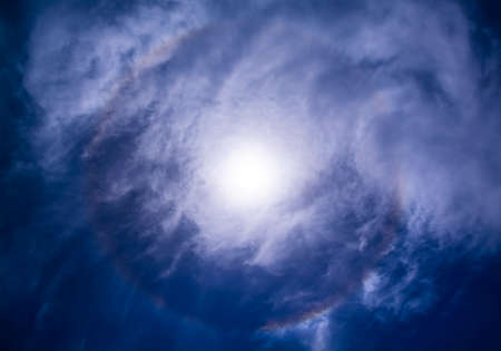The clear circular rainbow surround the bright sun, its phenomenon of the sun halo. The phenomenon is occurred by the light and moisture refraction.