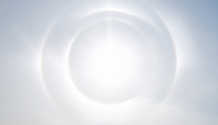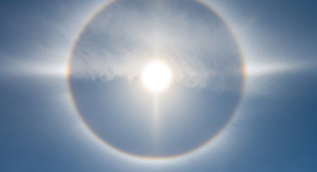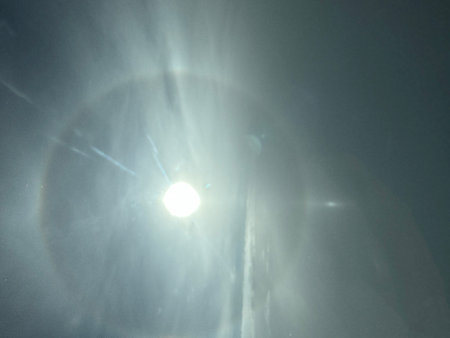 A brilliant 22-degree sun halo appears in thin cirrostratus clouds, creating a mesmerizing celestial ring caused by ice crystal refraction.