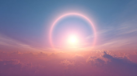 Experience a breathtaking sunrise with soft clouds and a glowing halo, creating a serene atmosphere in gentle pastel hues, perfect for evoking peace and tranquility.
