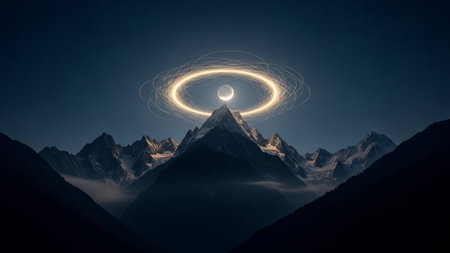 A surreal landscape unfolds under a dark, star-filled night sky. A full moon is positioned directly above the highest peak of a snow-capped mountain range. A luminous, swirling halo of light encircles the moon, creating an ethereal and otherworldly effect. The surrounding mountains are silhouetted against the dark sky, with hints of snow catching the moonlight. evokes a sense of wonder, magic, and cosmic beauty.