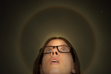 A bald person with a glowing blue halo effect, gazing upwards in a dark environment, creating a serene and ethereal atmosphere
