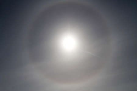 Natural optical phenomenon of sun with halo. Full circle 22° halo around Sun at noon produced by light from the Sun interacting with ice crystals suspended in the atmosphere.