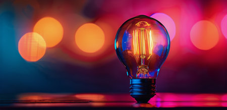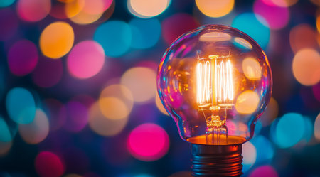 A glowing light bulb with colorful bokeh lights in the background, representing creativity, innovation, and bright ideas in a visually appealing composition.