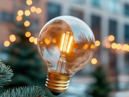 Close-up of a vintage light bulb glowing warmly with bokeh lights in the background. Ideal for lighting and decor themes.