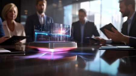 Futuristic interactive touchscreen displaying holographic data in a business setting