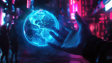 A glowing globe hovers above a hand, with a cityscape in the background and a dark blue sky. The visual style is modern, with bright blues and dark tones. It suggests concepts of technology, global connection, and data visualization, suitable for various editorial and commercial applications.