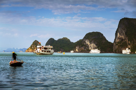 Ha Long Bay, VIETNAM - 21 August, 2016: Tourist junks floating among at Ha Long Bay
