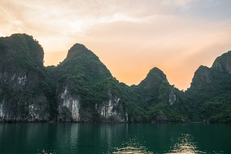 Ha Long Bay in Vietnam during a beautiful Sunset with calm, tranquil seas. Shot in Autumn 2019 from a cruise ship tour