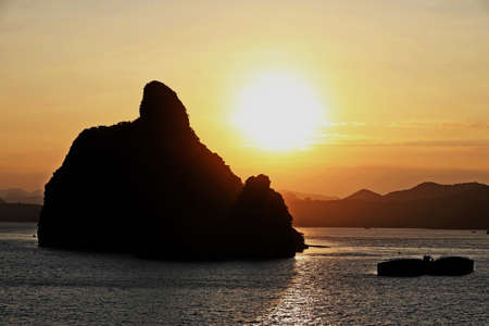 Dreamy sunset among the rocks of Halong Bay, Vietnam